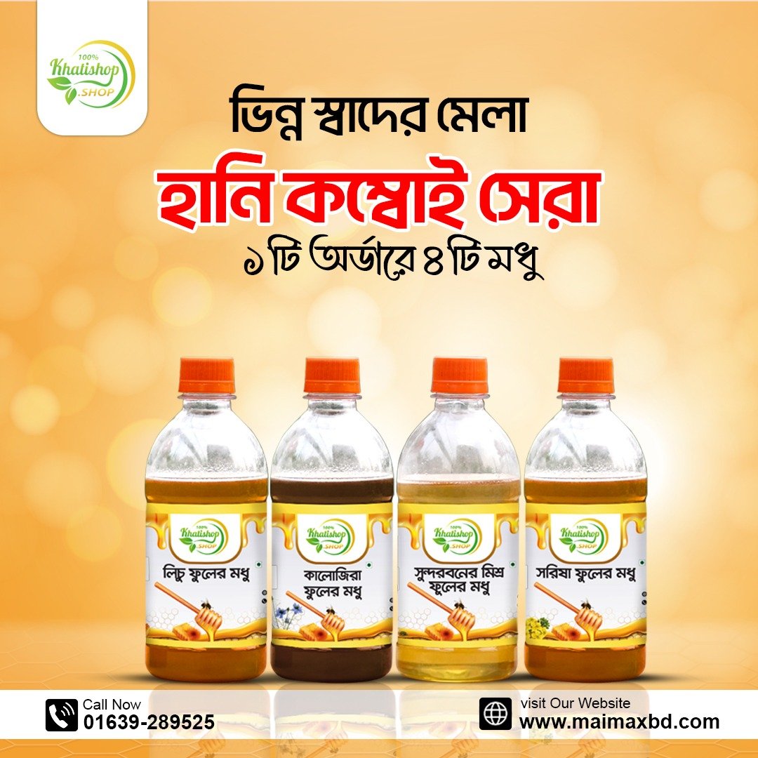 কালোজিরা ফুলের মধু + সুন্দরবনের মিশ্র ফুলের মধু + লিচু ফুলের মধু + সরিষা ফুলের মধু